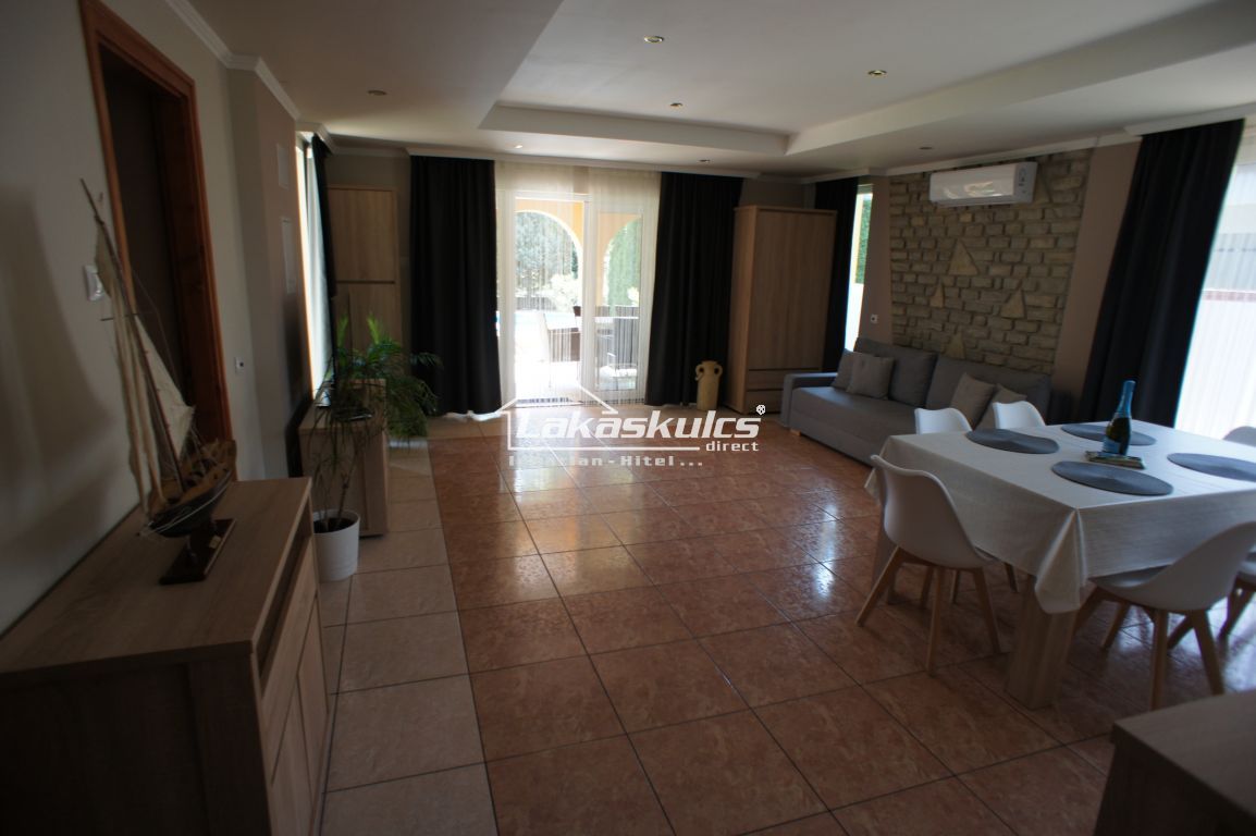 A házba egy kellemes méretű, fedett teraszon keresztül jutunk be a nappali-étkező részbe, ahonnan a konyha, a két hálószoba nyílik, valamint egy kis közlekedő, amiből a különálló WC-be és mellette a fürdőszoba/zuhanyzóba léphetünk be.