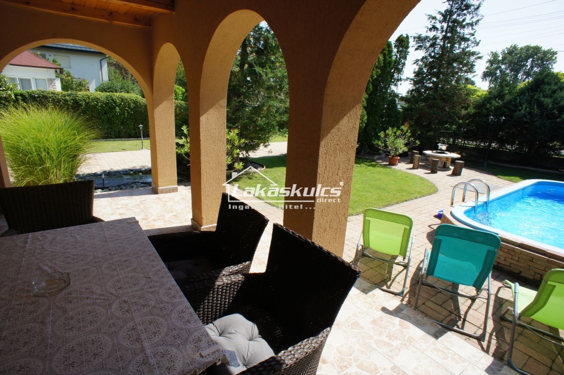 Az ingatlannak szép, gondosan kialakított, gondozott kertje van, itt egy úszómedence, kerti sütögető/bográcsoló, dísztavacska és egy tároló céljára felállított faházikó kapott helyet, a kapu automata, szép, kovácsoltvas kerítéssel. Az épület mellett praktikusan két gépkocsi számára kialakított térköves beálló áll rendelkezésre. A házban kiépítésre kerül a TV és internet hálózat, a klímaberendezés és a riasztó.