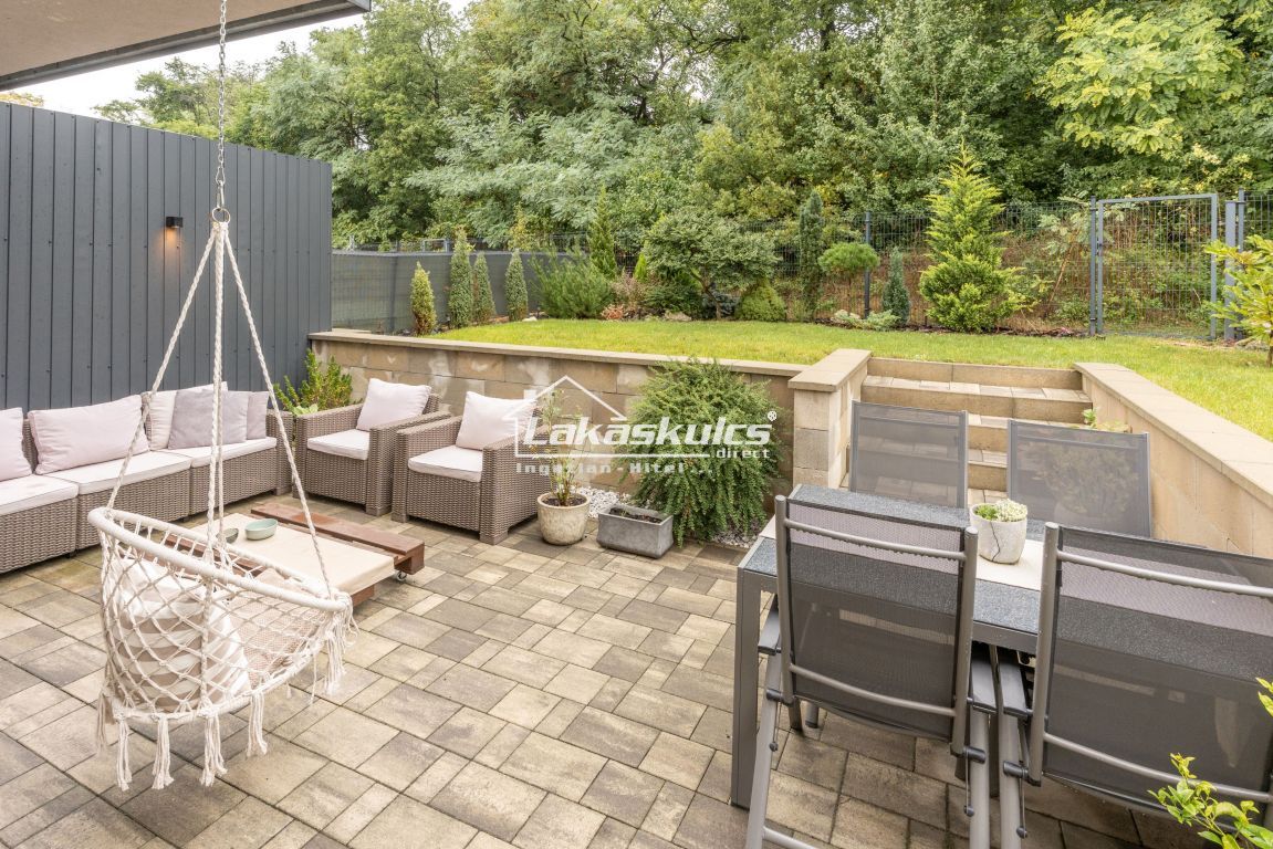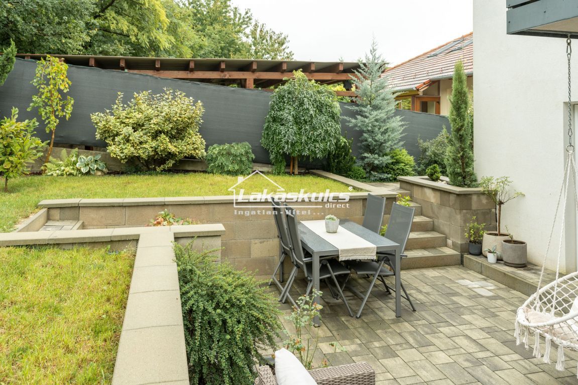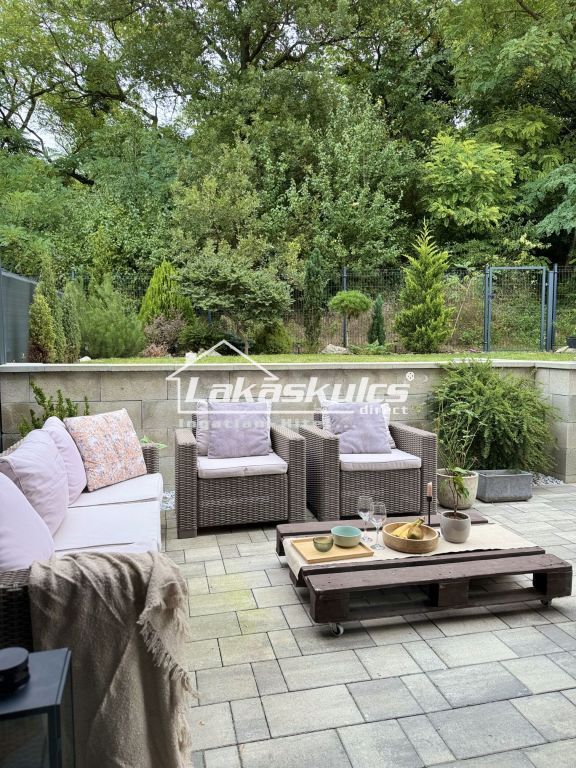 A lakáshoz 138 m²-es, kizárólagos használatú kert tartozik, közvetlen erdőkapcsolattal. A kert határos a Natura 2000-es tájvédelmi területtel, így a természet közelsége és a teljes nyugalom garantált.