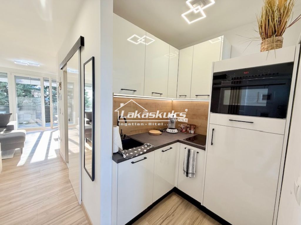 30 m²-es, nappali + hálószobás, erkélyes apartmanlakás. Az ingatlan egy 3 szintes épület 3. emeletén található. Az erkélyről kis Balatoni panoráma is látható csendes, s zöld parkra néz.